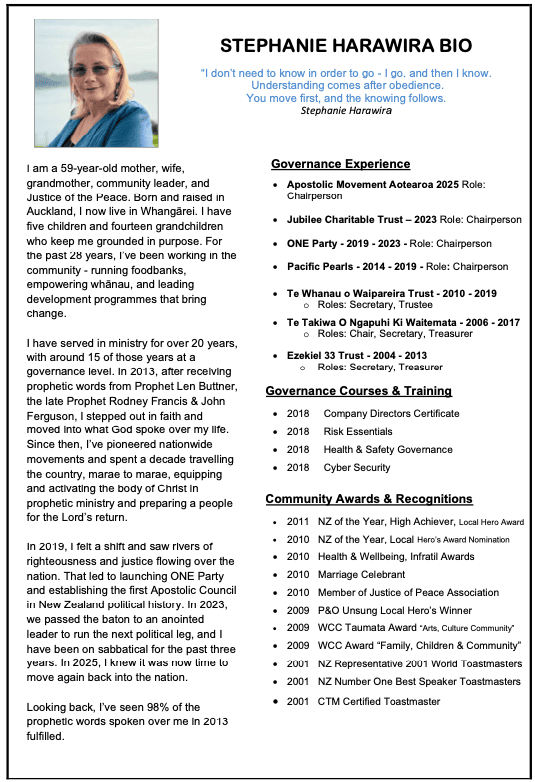 Stephanie Harawira is the founder of the Jubilee Charitable Trust and Chairperson of the Apostolic Movement Aotearoa.
